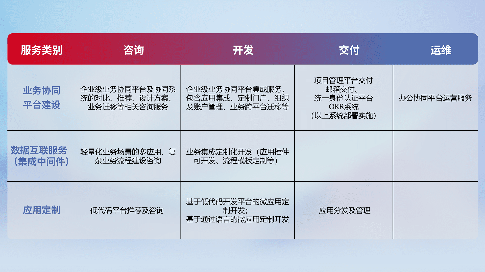 针对钉钉、、、企微、、、、IDaas等平台级产品提供产品的规划、、、、方案、、交付、、、、定制化开发等服务,,,,实现如统一协同办公、、智能客户服务、、混合会议管理、、智能数据查询、、、等业务场景,,,实现数字化转型。。。