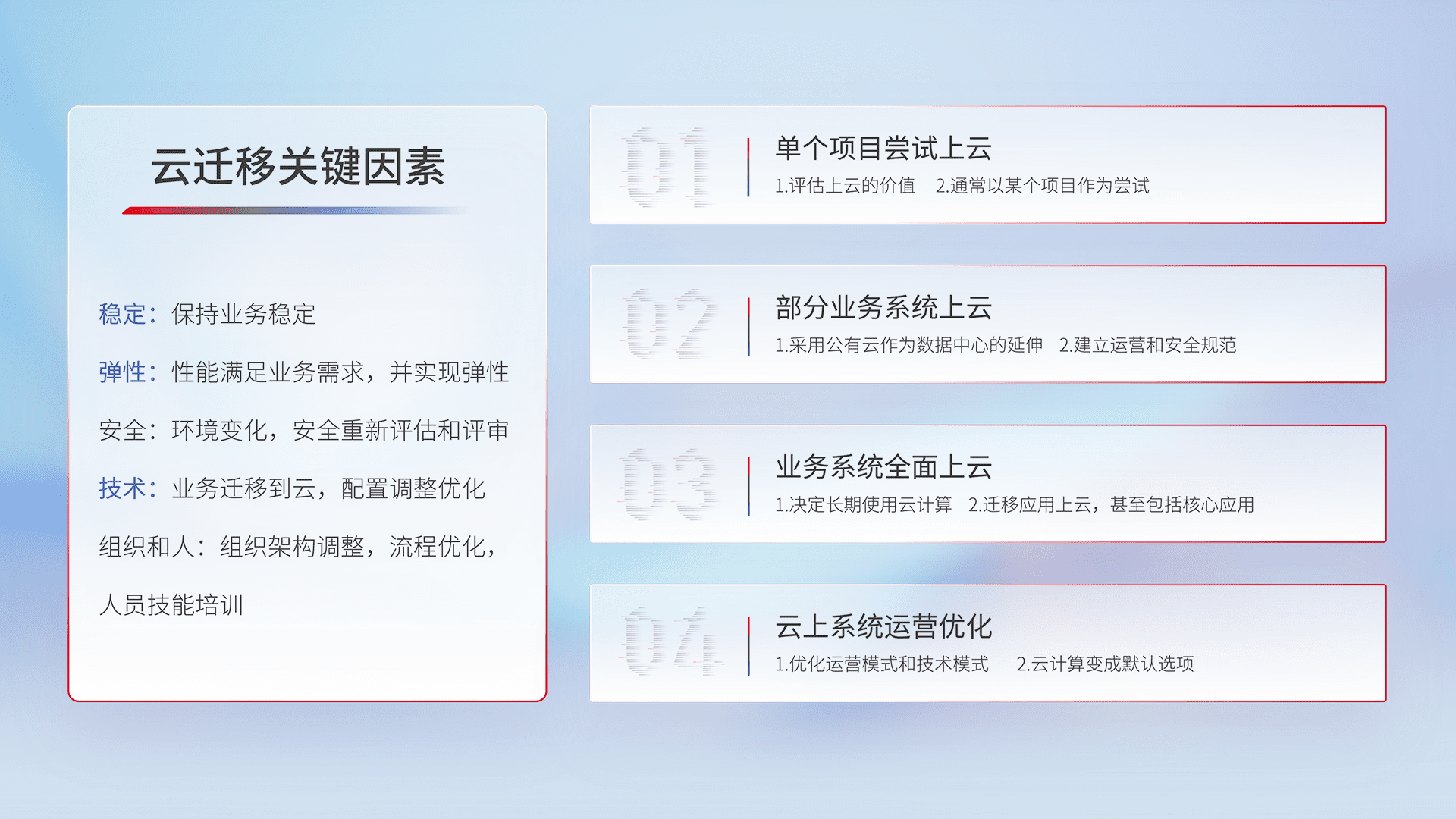 结合实际业务,,,,从规划设计、、云平台选型、、、、云原生改造、、、数据迁移、、集成交付,,迁移全过程为客户识别最佳上云路径,,,,做好风险识别管理,,,设计网络架构、、、、身份权限、、、安全审计合规、、、、操作审计、、日志审计、、、监控告警策略、、、、多站点容灾设计等,,,对云上基础设施进行整体规划,,提升IT治理水平,,以满足弹性、、、、高可用、、高性能的需求。。。